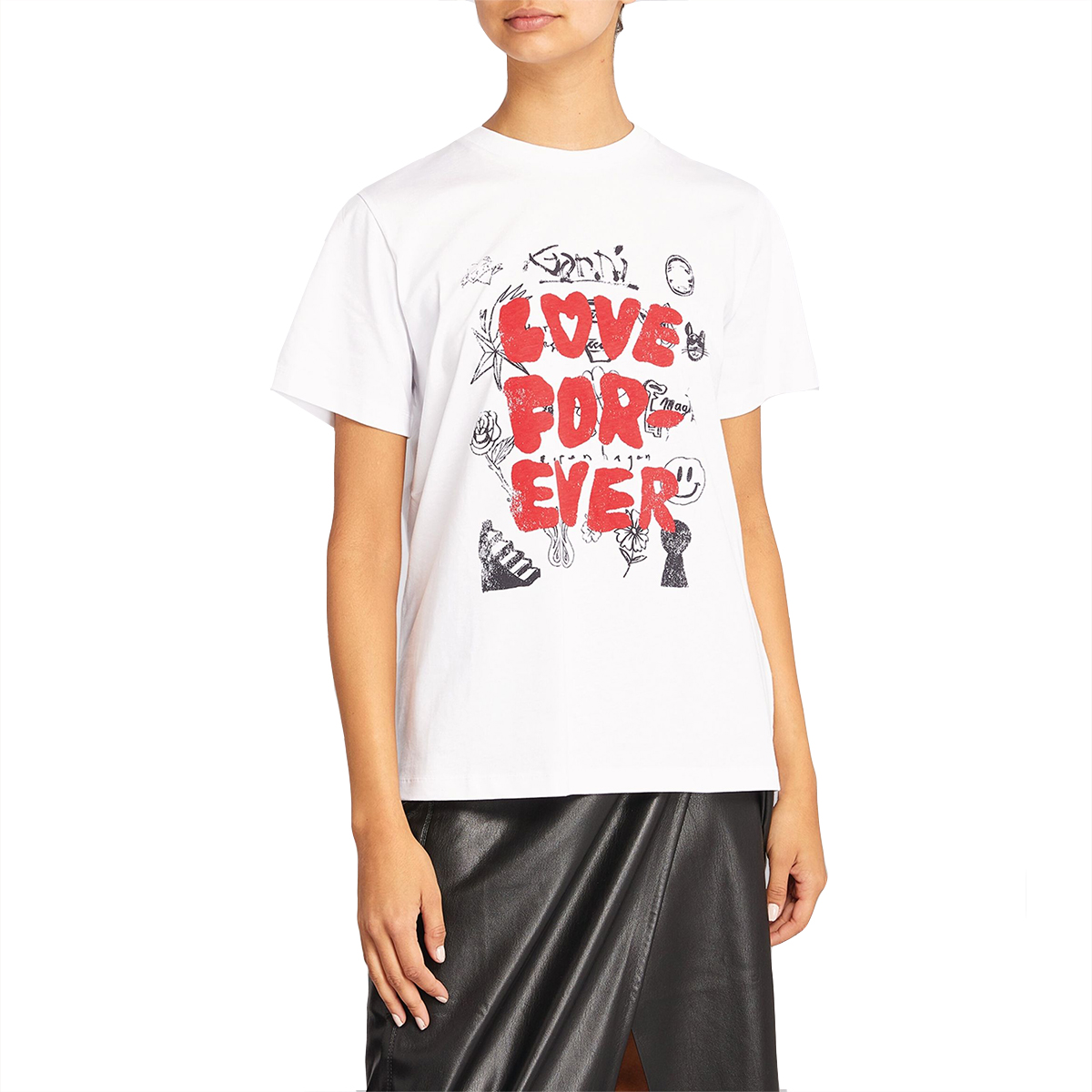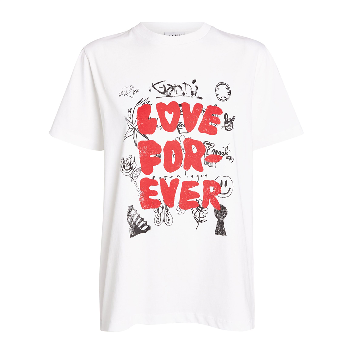 Love Forever Logo T-shirt Short sleeve Regular fit Ribbed crewneck Front "Love Forever" lettering and doodle prints Color: White Material: 100% Organic Cotton
