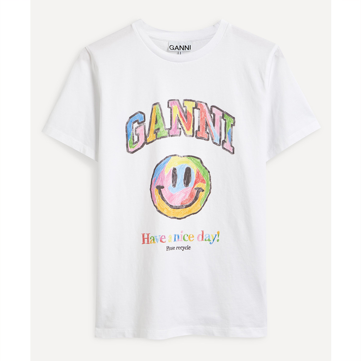 Ganni Cotton Crayon Smiley Print Rainbow Tee in White