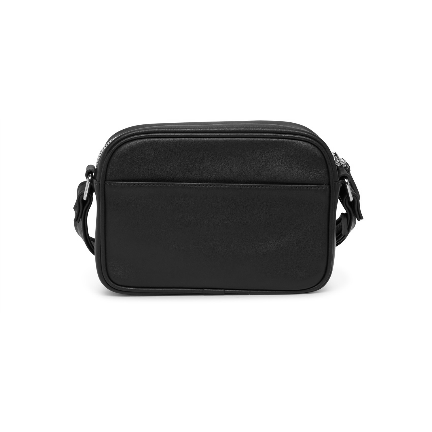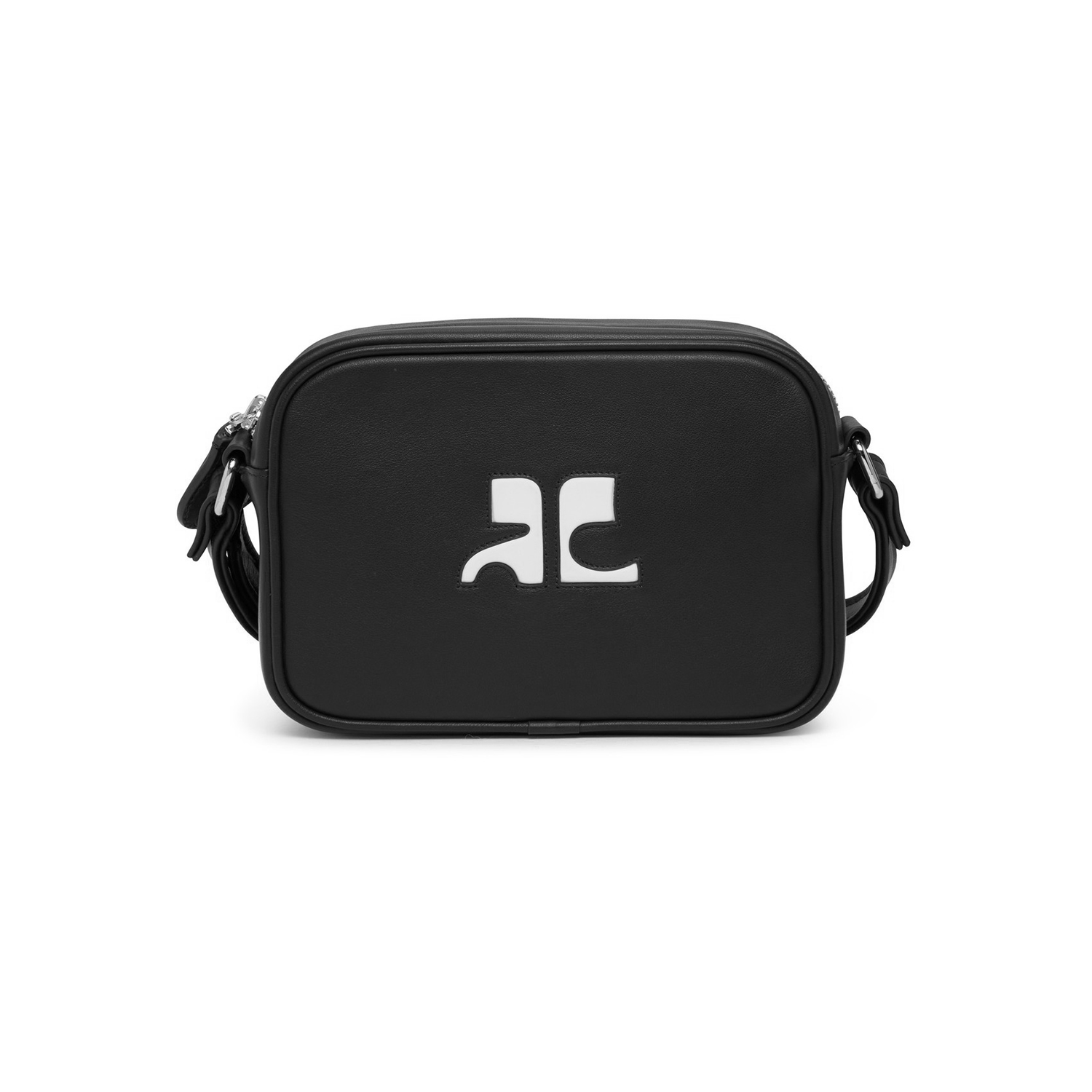 Reedition leather camera bag from COURRèGES featuring black leather, smooth grain, logo embellishment, silver-tone hardware, top zip fastening and adjustable shoulder strap.