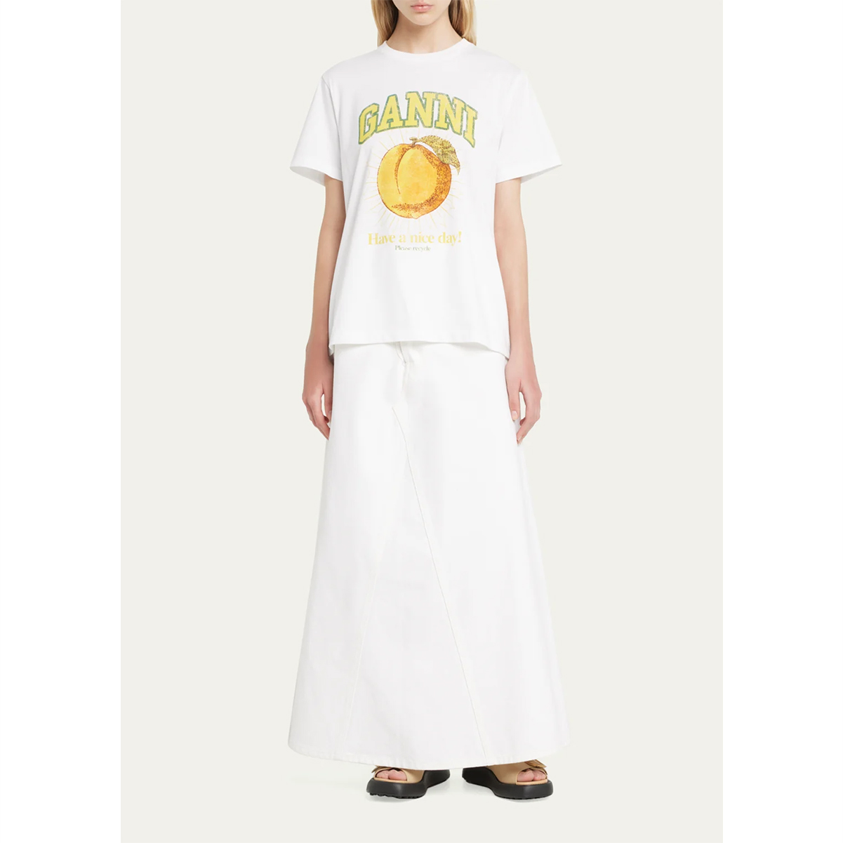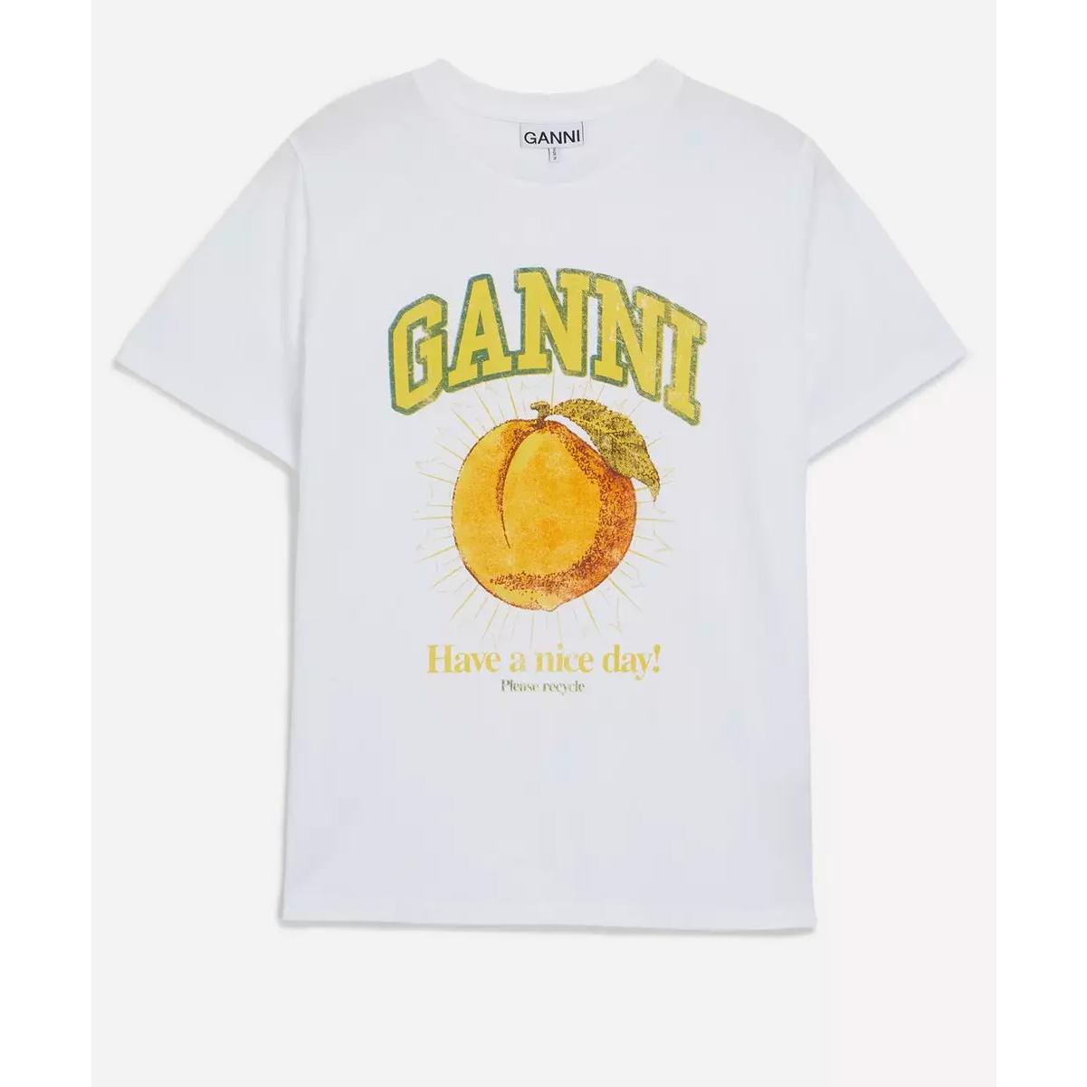 Ganni basic jersey graphic tee featuring peach motif Crew neckline Short sleeves Relaxed fit Hem falls to the hip Pullover style 100% Cotton Machine wash cold